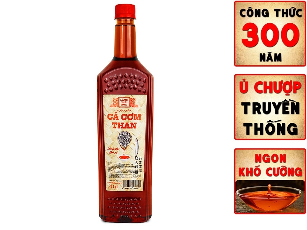 Nước chấm cá cơm than Làng Chài Xưa chai nhựa cao cấp 1 lít có hương vị thanh dịu được ủ chượp từ 100% cá cơm tươi trong thùng lều gỗ lâu năm.