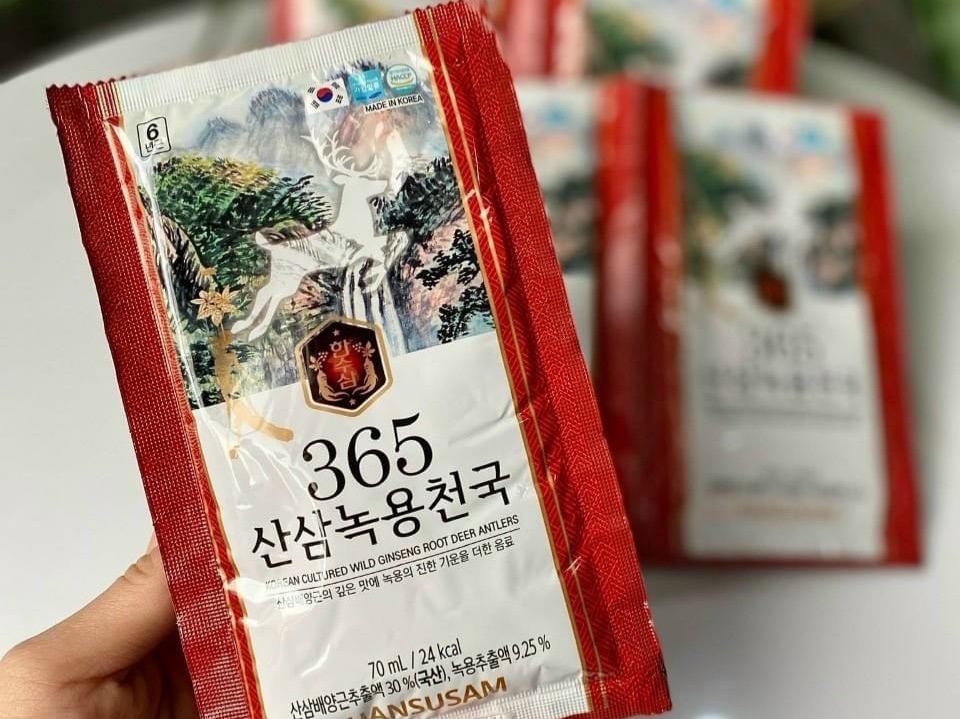 Hộp 30 gói /70ml sâm núi 🍀🍀 NƯỚC HỒNG SÂM NÚI 365 HANSUSAM 30 GÓI🇰🇷🇰🇷👉 giá tốt ạ 🔰 THÀNH PHẦN Chiết xuất hồng sâm núi (hàn quốc, 6 năm tuổi, thành phần hồng sâm 70mg/g, hàm lượng cô đặc 60%], chiết xuất nhung hươu ( hàm lượng cô đặc) 10.5%. Chiết xuấ